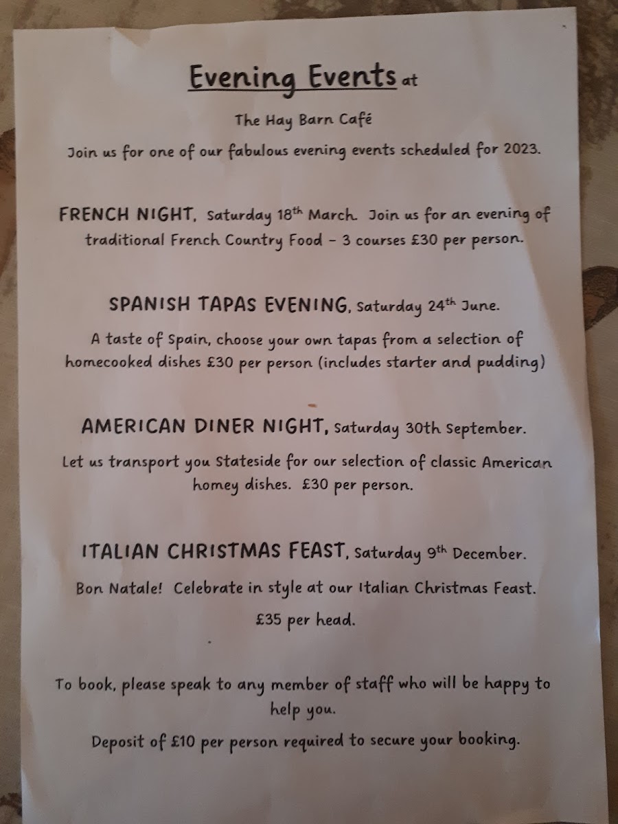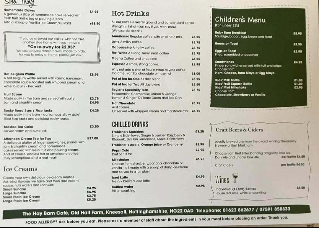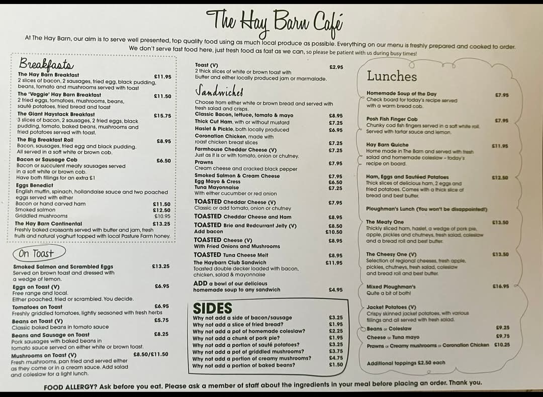 From a reviewer's perspective, the menu at The Hay Barn Cafe offers a comforting blend of hearty breakfasts and satisfying lunches, each thoughtfully presented. Breakfast options cater to every appetite, from the classic The Hay Barn Breakfast and indulgent The Giant Haystack Breakfast to the lighter ‘Veggie’ Hay Barn Breakfast, with simpler choices like 2 Slices Of Bacon or 2 Sausages also available. The Big Breakfast Roll is ideal for those on the go yet still craving a filling start to the day. Lunchtime brings a mix of traditional and creative options: the warming Homemade Soup Of The Day, playful Posh Fish Finger Cob, and the savory Hay Barn Quiche. Fans of classic fare can enjoy Ham, Eggs And Sautéed Potatoes or the rustic Ploughman’s Lunch, each delivering wholesome, familiar flavors. For lighter bites or afternoon treats, the café offers an array of fillings for sandwiches and toast, including Farmhouse Cheddar Cheese, Prawns, Smoked Salmon & Cream Cheese, Tuna Mayonnaise, and Toasted Cheddar Cheese, allowing for simple yet satisfying choices. Overall, the menu balances generous portions with a comforting, homey feel, reflecting a dedication to both quality and variety that makes The Hay Barn Cafe a reliable spot for breakfast, lunch, or a casual snack.